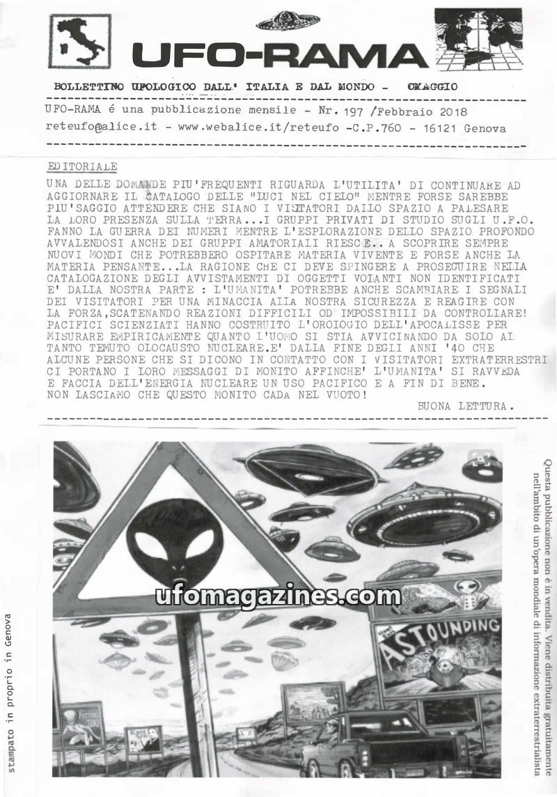 This issue of UFO-RAMA (February 2018) discusses the ongoing utility of cataloging UFO sightings, the potential for discovering extraterrestrial life in deep space, and the importa