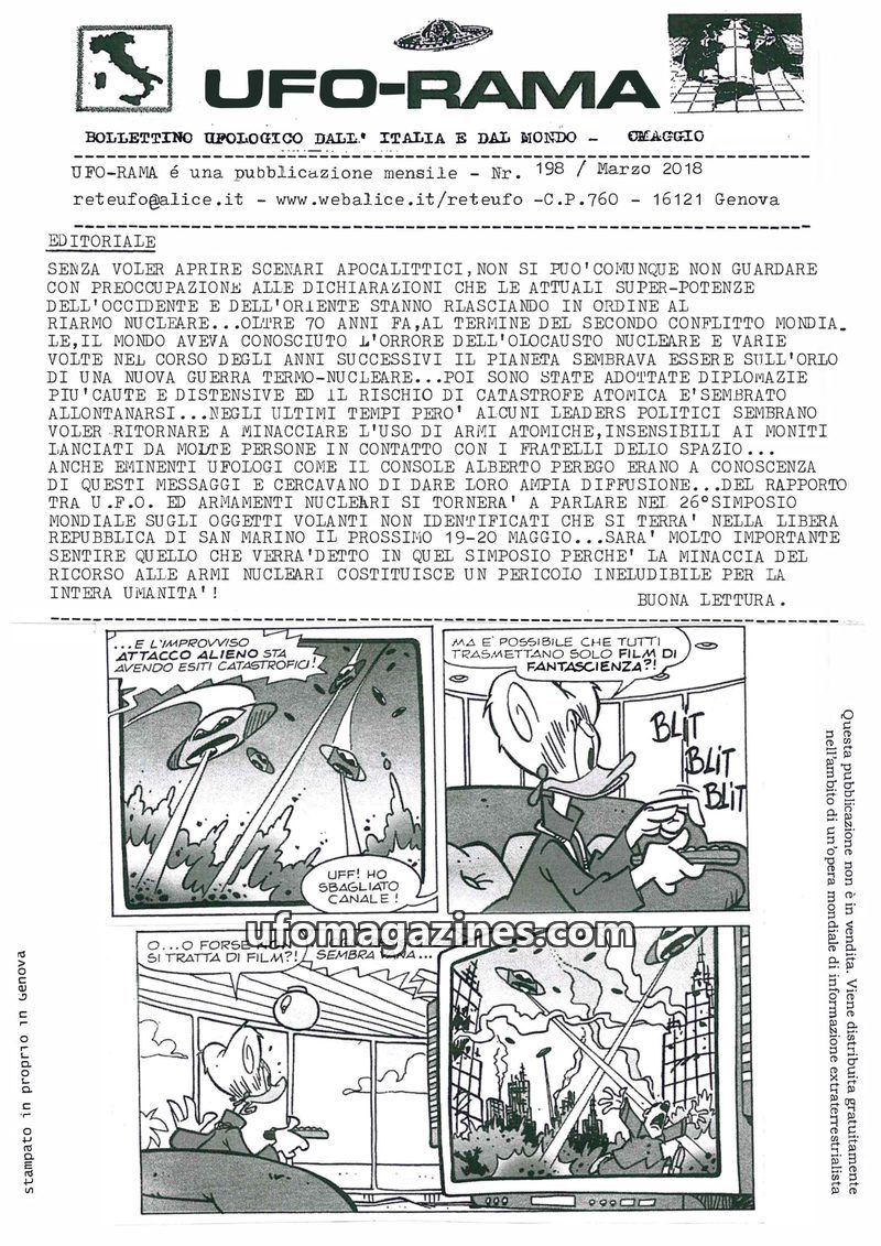 This issue of UFO-RAMA (March 2018) highlights concerns over nuclear rearmament by global superpowers, contrasting it with the ongoing efforts for disarmament. It reports on the in