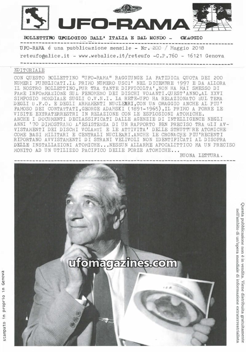 This issue of UFO-RAMA celebrates its 200th publication, highlighting the connection between UFO sightings and atomic installations, referencing declassified intelligence documents