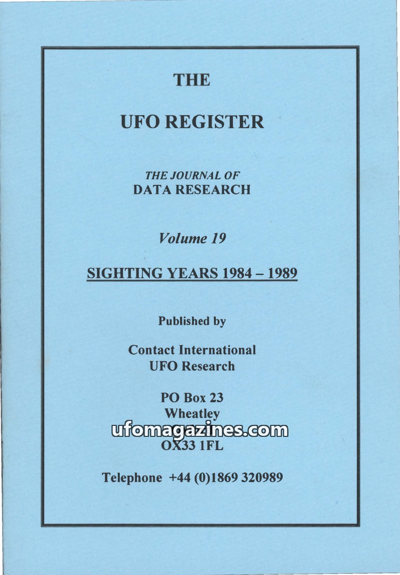 This issue of The UFO Register, Volume 19, covers UFO sighting data from 1984 to 1989. It is compiled by members of the Data Research Team of Contact International UFO Research. Th