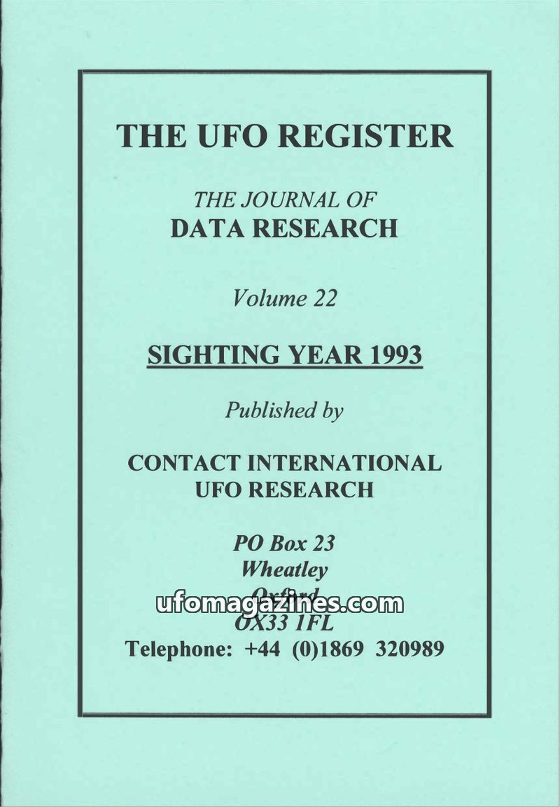 This issue of The UFO Register, Volume 22, focuses on UFO sightings from 1993, compiled by Contact International UFO Research. It details various sightings, categorizing them by sh