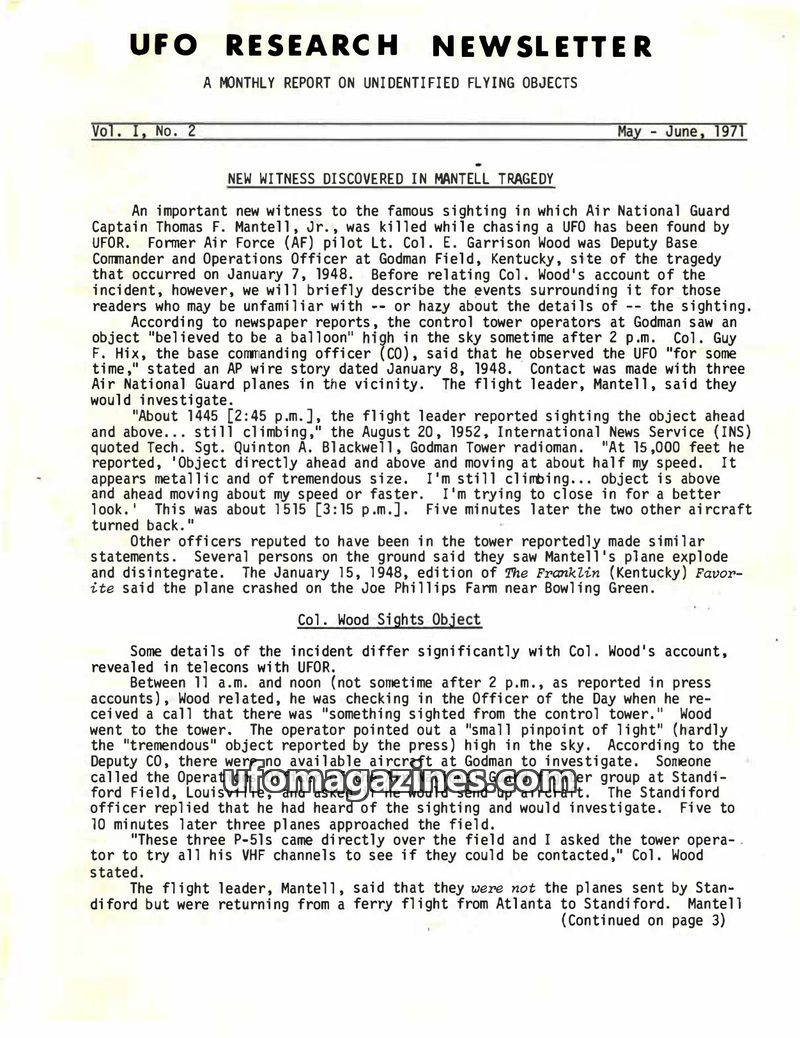 This issue of the UFO Research Newsletter features a new witness account of the 1948 Mantell tragedy, providing details that differ from previous reports. It also includes a discus