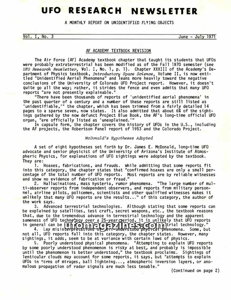 This issue of the UFO Research Newsletter details the revision of the Air Force Academy's textbook chapter on UFOs, which now leans towards more cautious conclusions. It also featu
