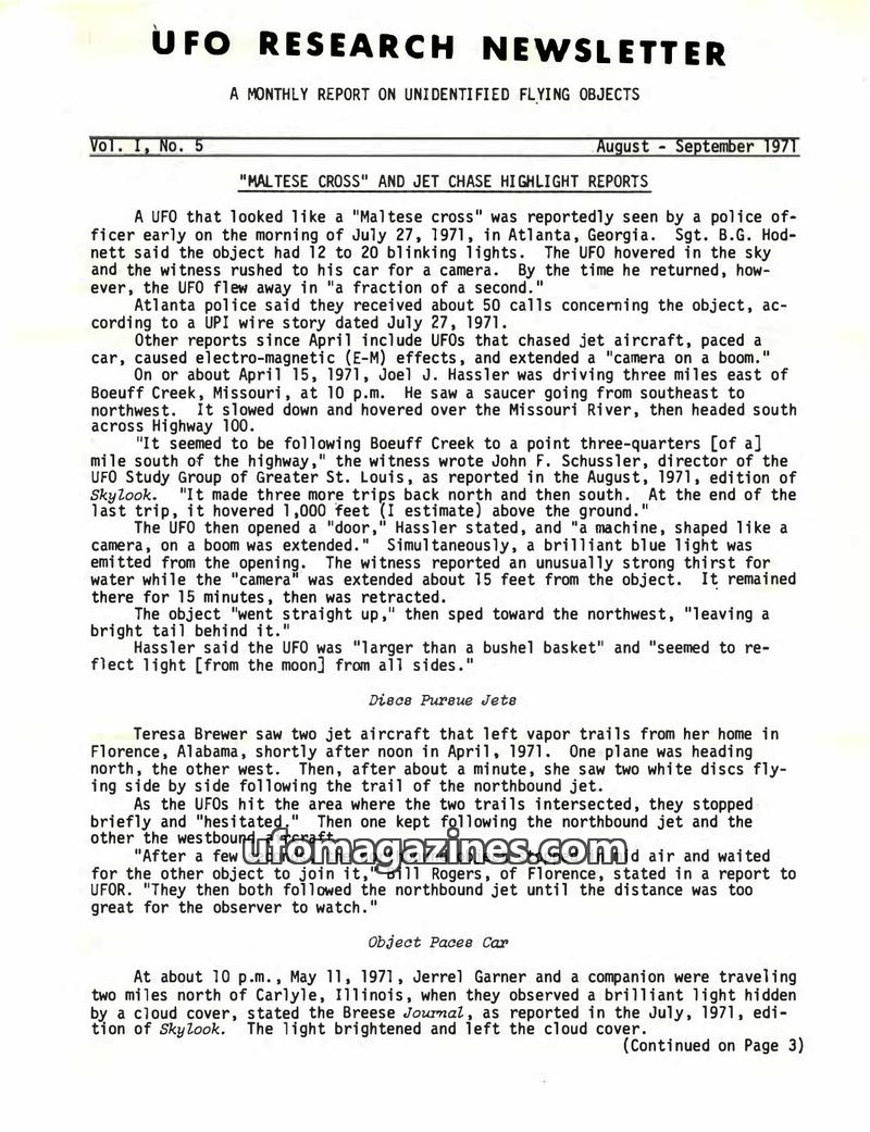 This issue of UFO Research Newsletter covers numerous UFO sightings from early 1971, including a "Maltese Cross" object in Atlanta and a jet chase incident in Alabama. It details r