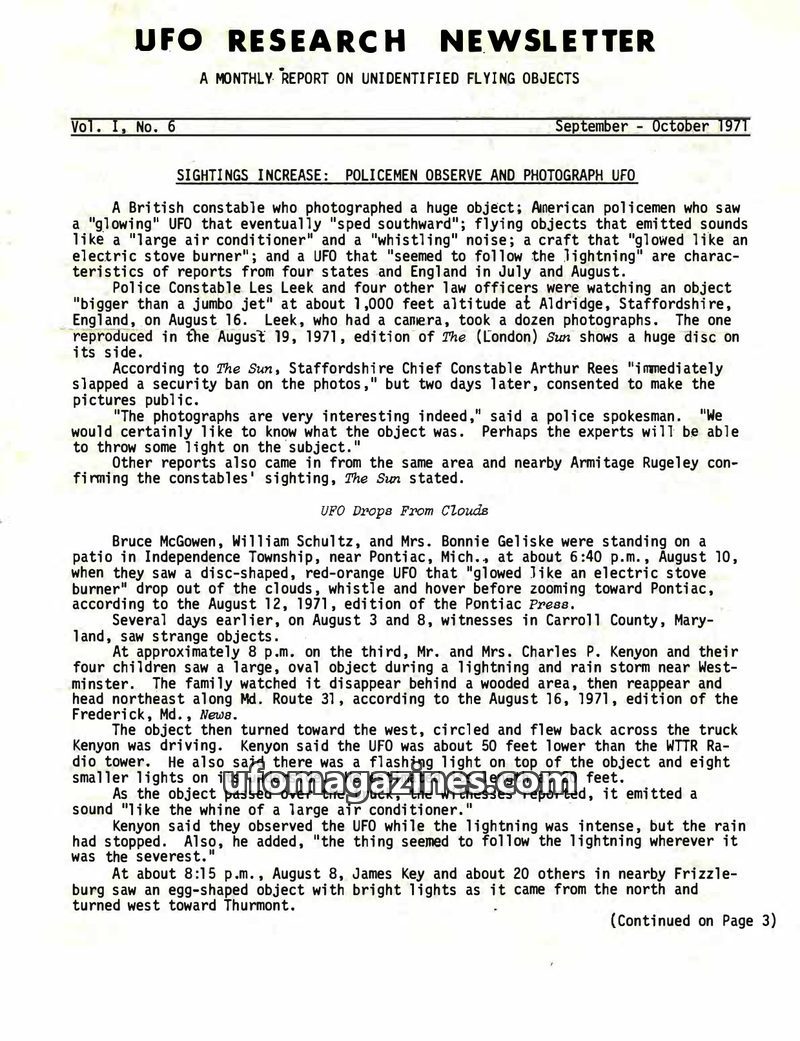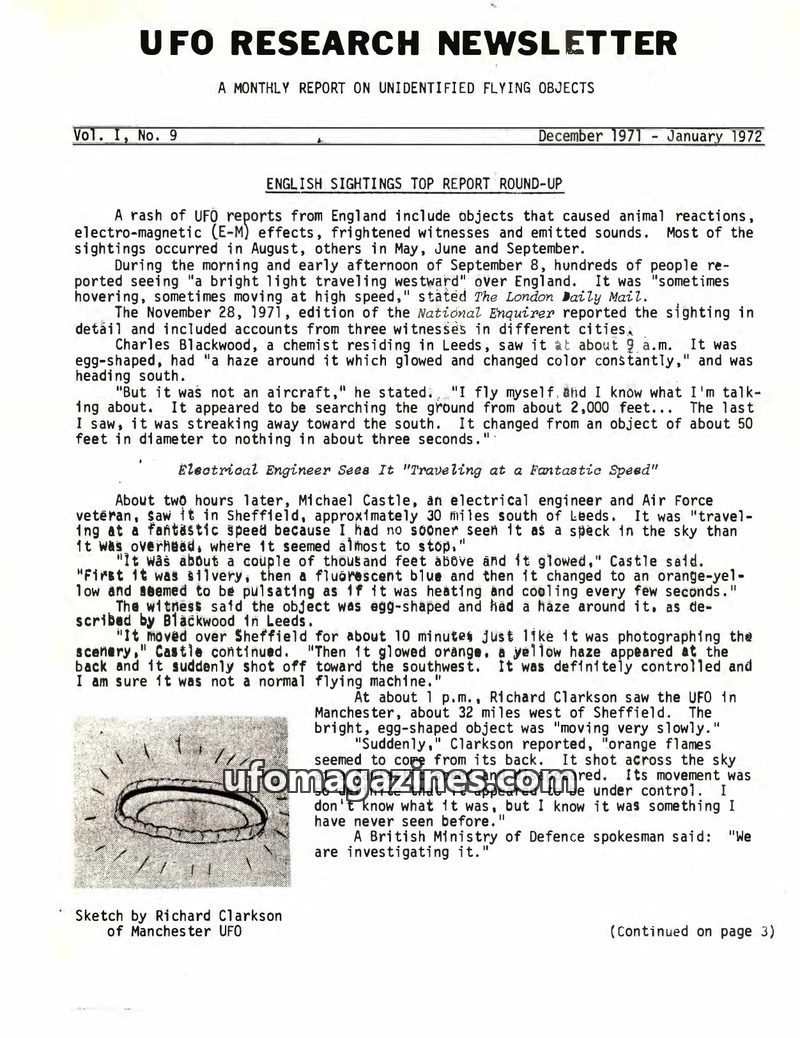 This issue of the UFO Research Newsletter reports a series of UFO sightings in England during 1971, characterized by animal reactions, electromagnetic effects, and unusual object b