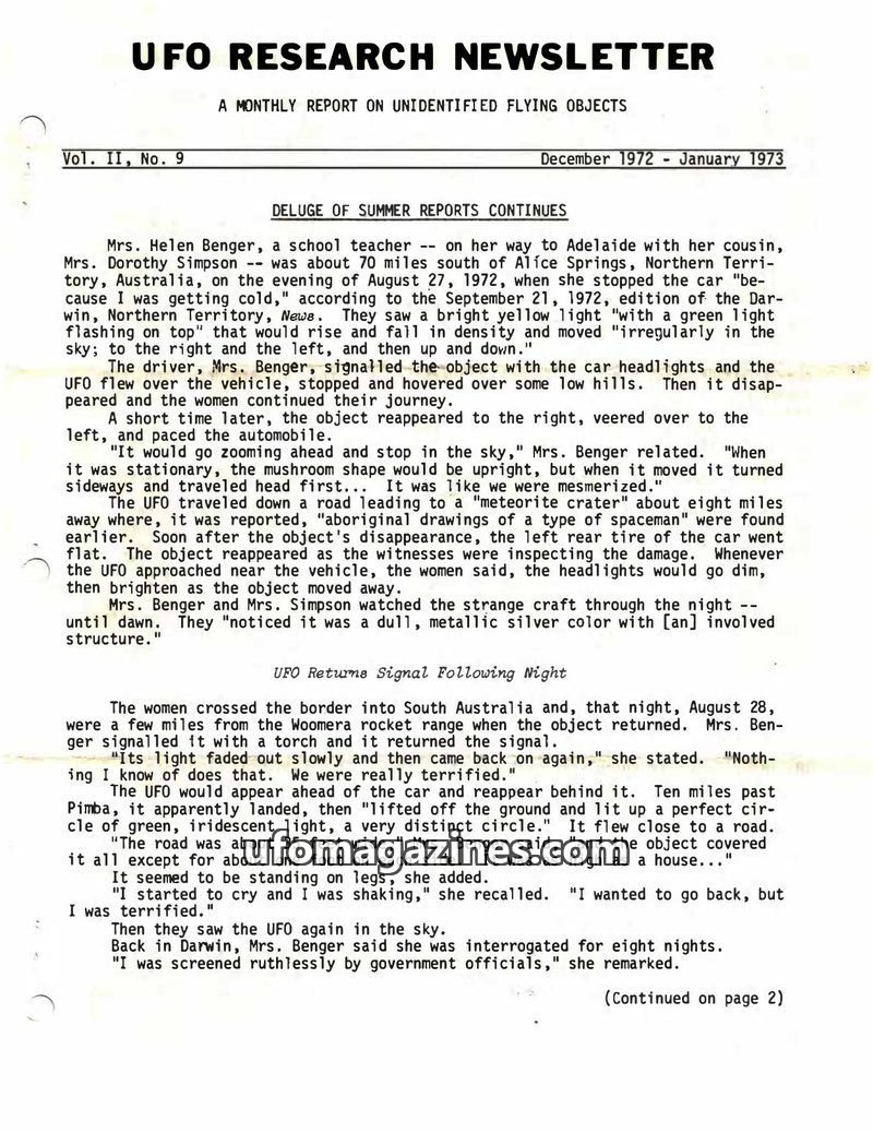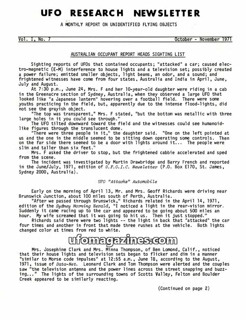 This issue of the UFO Research Newsletter covers a range of UFO sightings and investigations from late 1971. It highlights Australian reports of UFOs with occupants, and an inciden