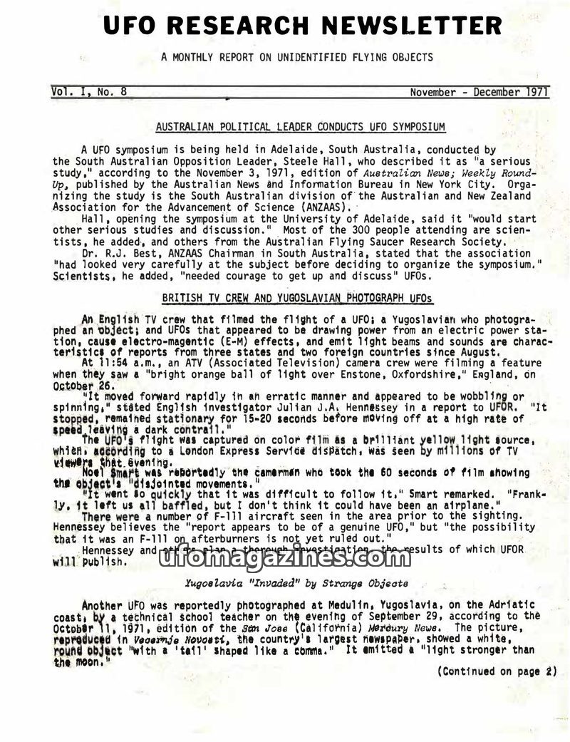 This issue of UFO Research Newsletter details an Australian UFO symposium led by Opposition Leader Steele Hall, highlighting the scientific community's engagement with the subject.