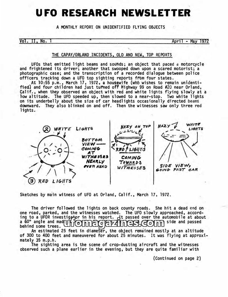 This issue of the UFO Research Newsletter covers multiple UFO sightings, including the Capay/Orland incidents in California involving objects with lights, sounds, and unusual maneu