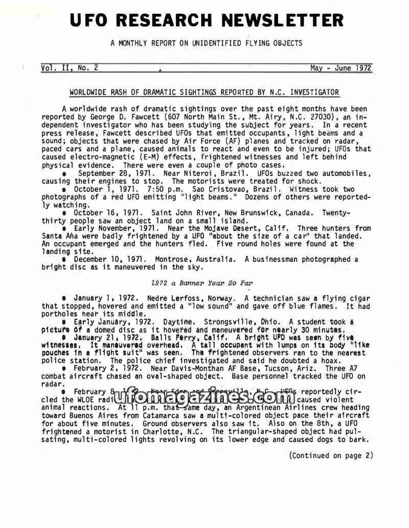 This issue of the UFO Research Newsletter (May-June 1972) reports a surge of dramatic UFO sightings worldwide, investigated by George D. Fawcett. It highlights incidents involving