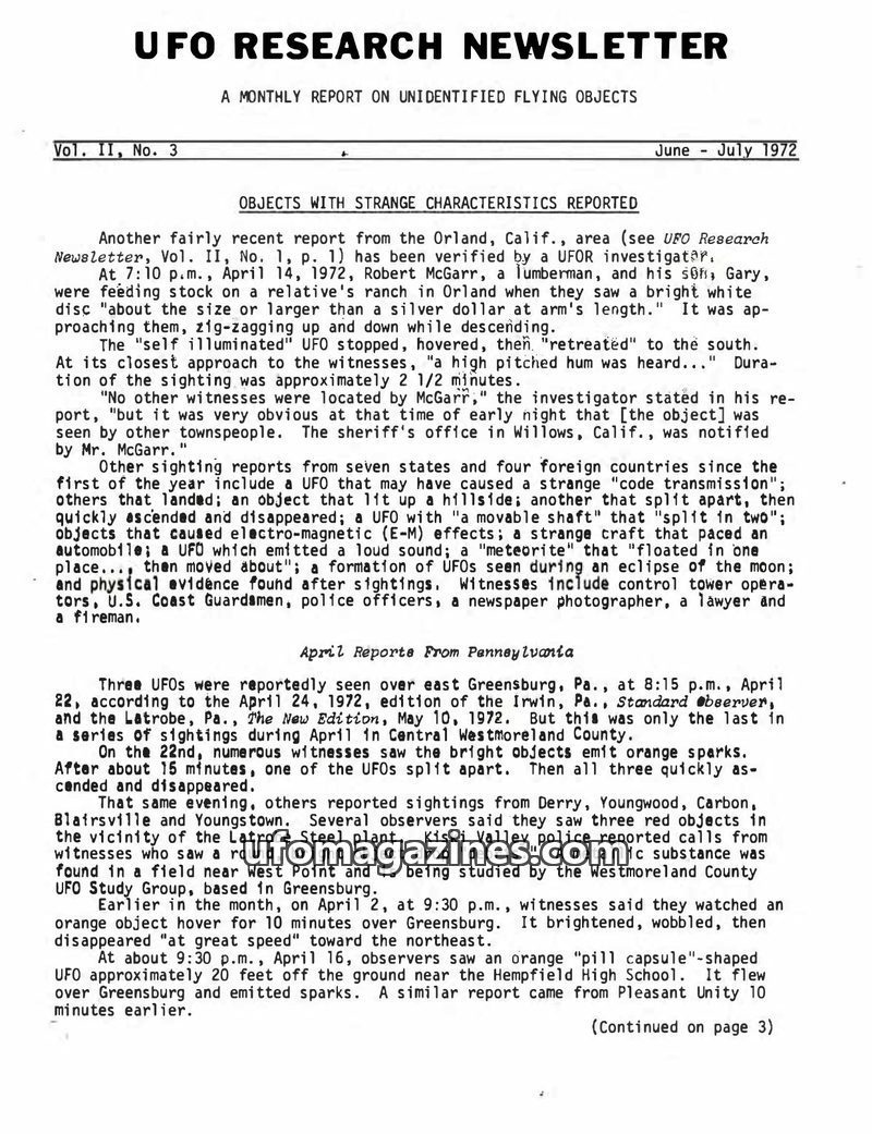 This issue of the UFO Research Newsletter from March-April 1972 details numerous UFO sightings across the US, including a credit manager's encounter with a disc-shaped object in Ta