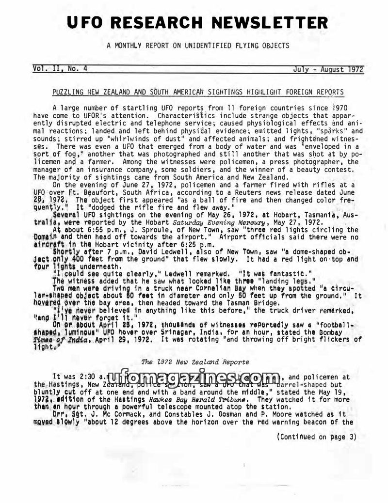 This issue of UFO Research Newsletter details numerous foreign UFO sightings from 1970-1972, primarily from New Zealand and South America. Reports describe objects with varied shap