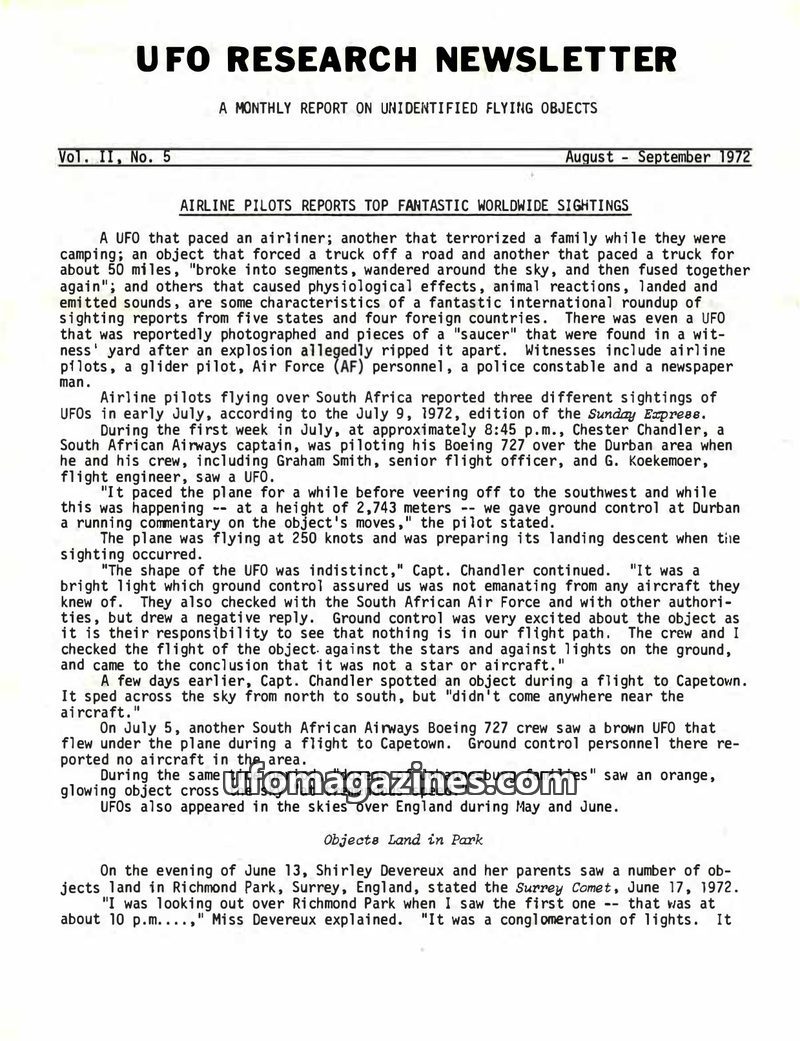 This issue of the UFO Research Newsletter reports numerous sightings from July 1972, including airline pilots in South Africa observing UFOs, a family in England witnessing objects