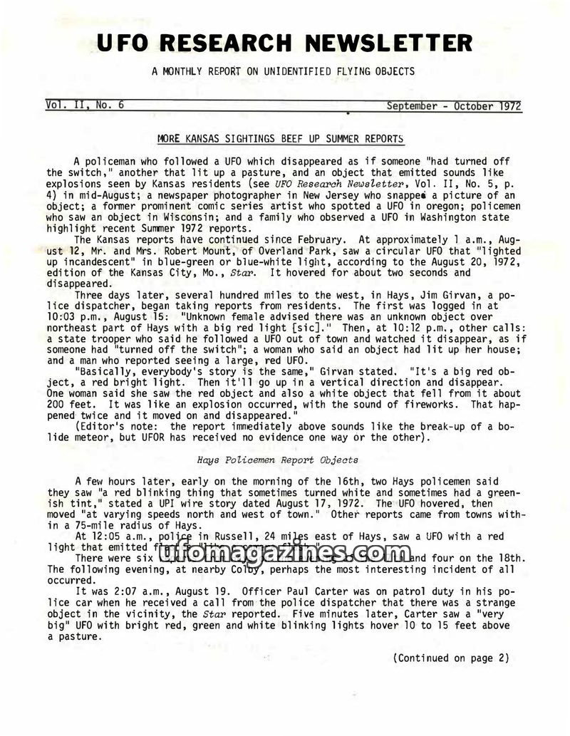This issue of the UFO Research Newsletter details numerous summer 1972 sightings, particularly in Kansas, involving objects described as red, bright, and fast-moving. Reports inclu