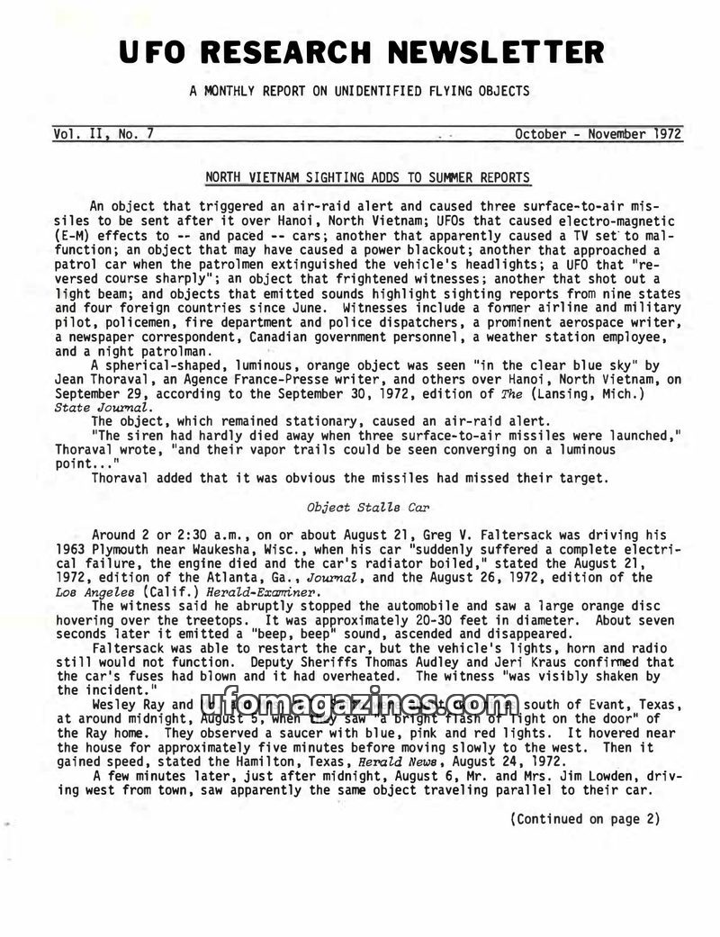 This issue of the UFO RESEARCH NEWSLETTER covers numerous UFO sightings from summer 1972, including a notable incident over Hanoi, North Vietnam, which triggered an air-raid alert