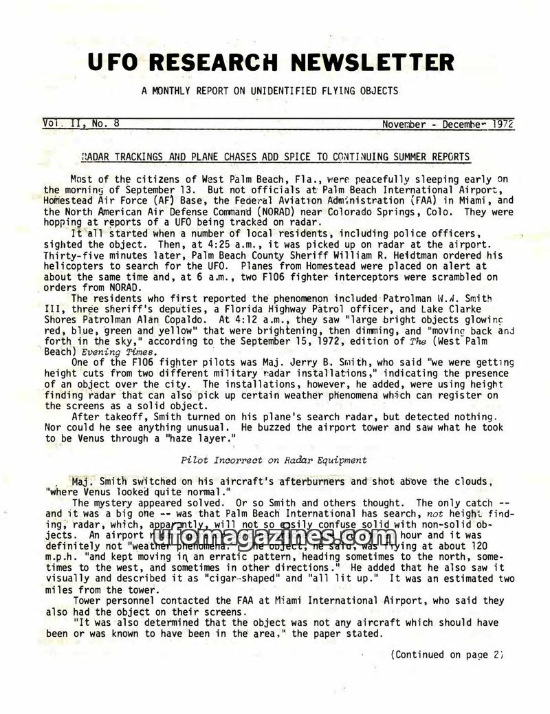 This issue of the UFO Research Newsletter details numerous UFO sightings and incidents from the summer of 1972. A significant event involved radar tracking and plane chases over We