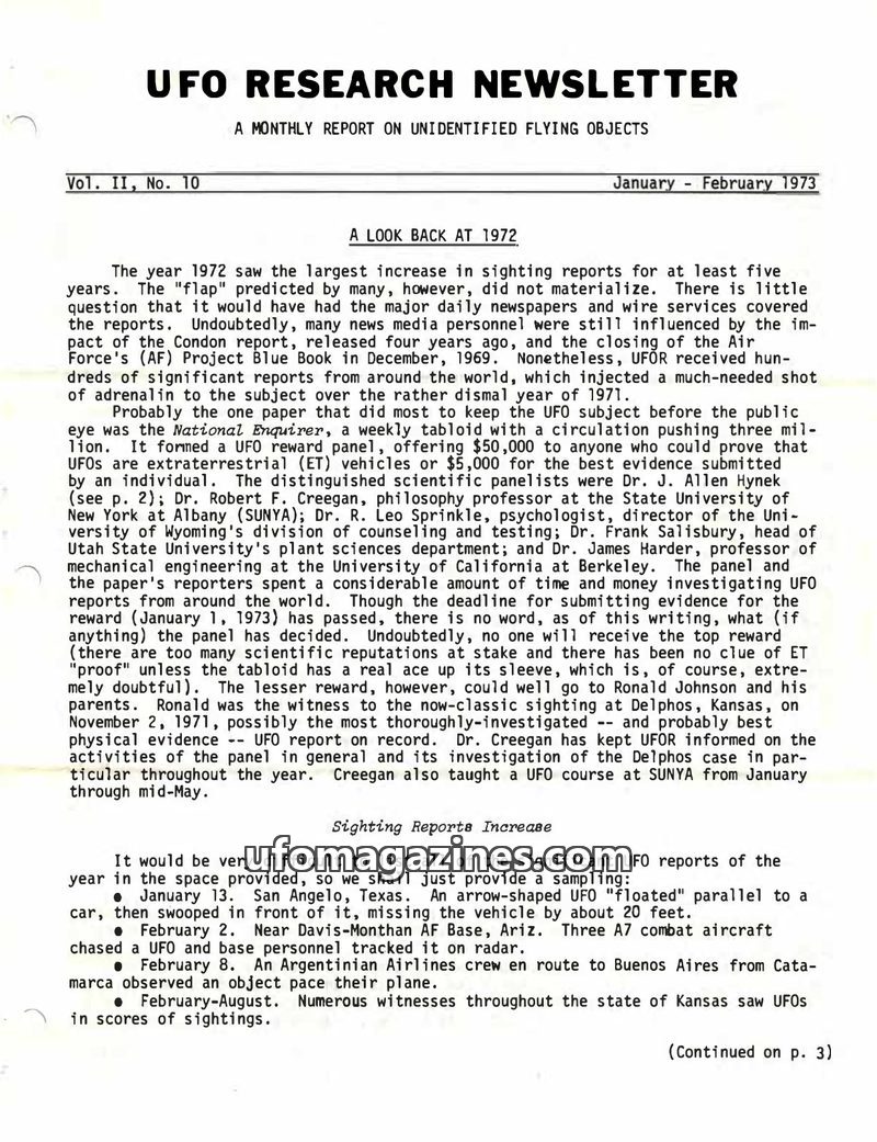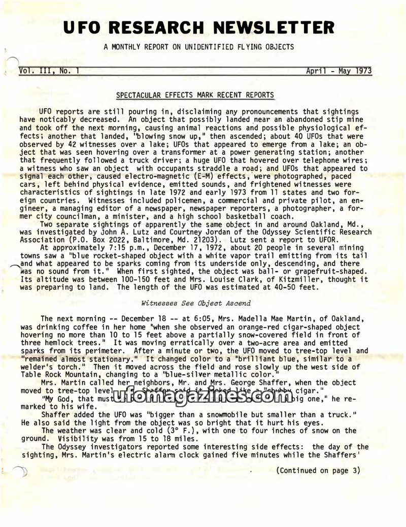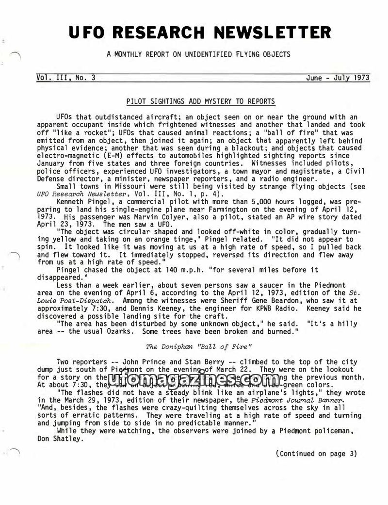 This issue of the UFO Research Newsletter details numerous pilot and civilian sightings of unidentified flying objects from early 1973 across the US and internationally. Reports in