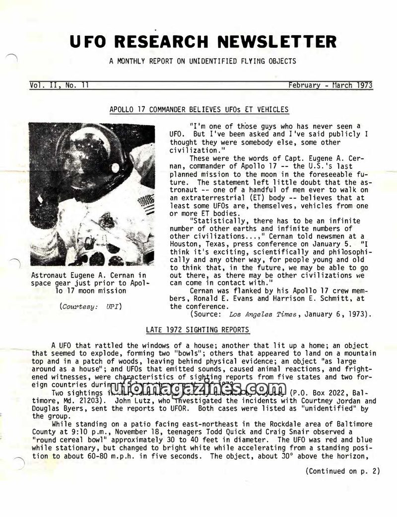 This issue of the UFO Research Newsletter from February-March 1973 highlights Apollo 17 Commander Eugene A. Cernan's public statement that he believes UFOs are vehicles from other