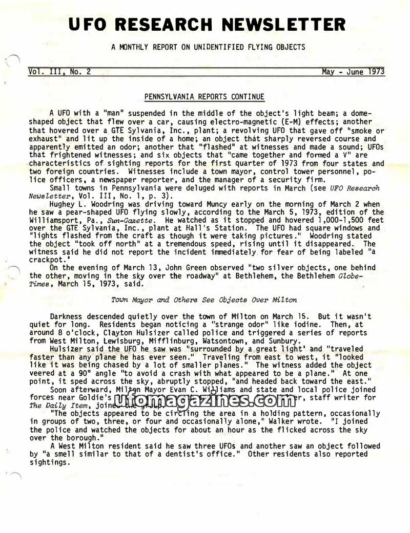 This issue of the UFO Research Newsletter details numerous UFO sightings from the first quarter of 1973, primarily focusing on reports from Pennsylvania. Incidents include objects