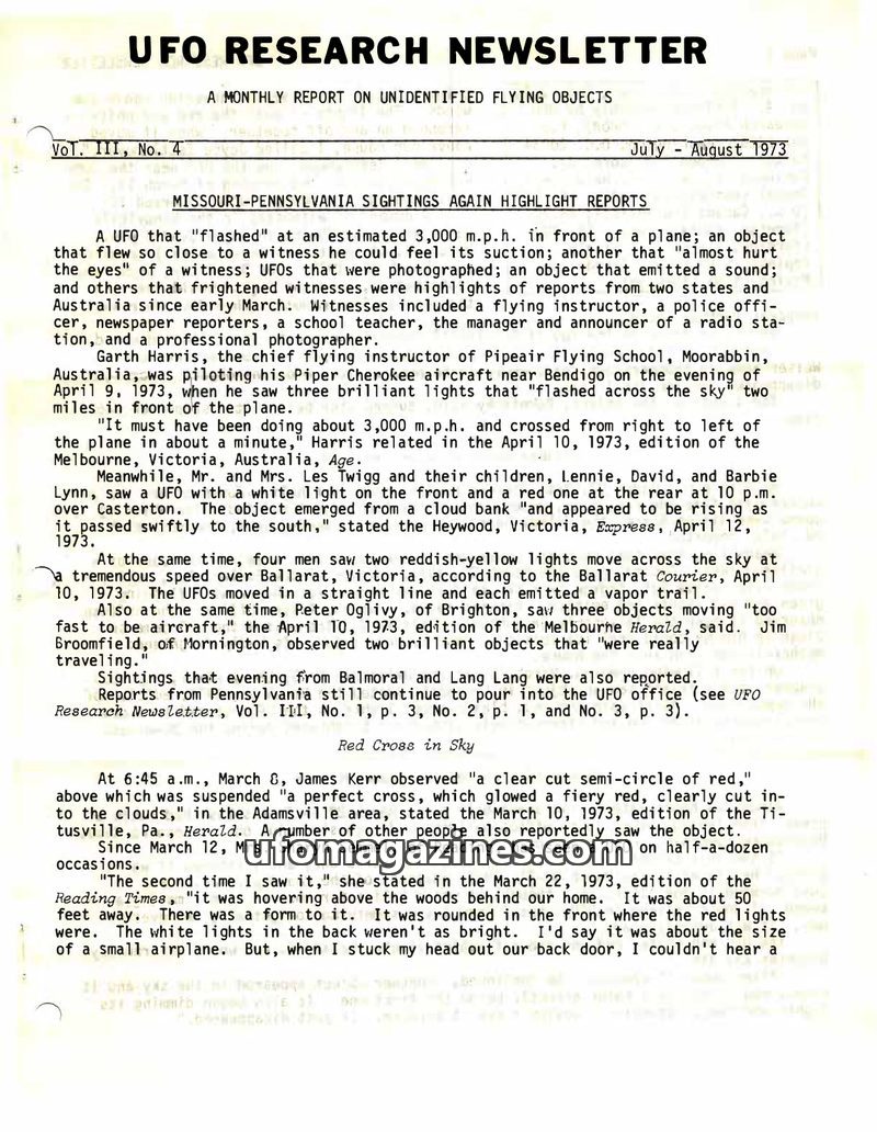 This issue of the UFO Research Newsletter covers numerous sightings from March and April 1973, primarily in Missouri and Pennsylvania, USA, and Australia. Reports include objects m