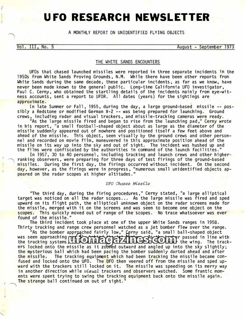 This issue of the UFO Research Newsletter details three previously undisclosed incidents from the 1950s at White Sands Proving Grounds where UFOs interacted with launched missiles.