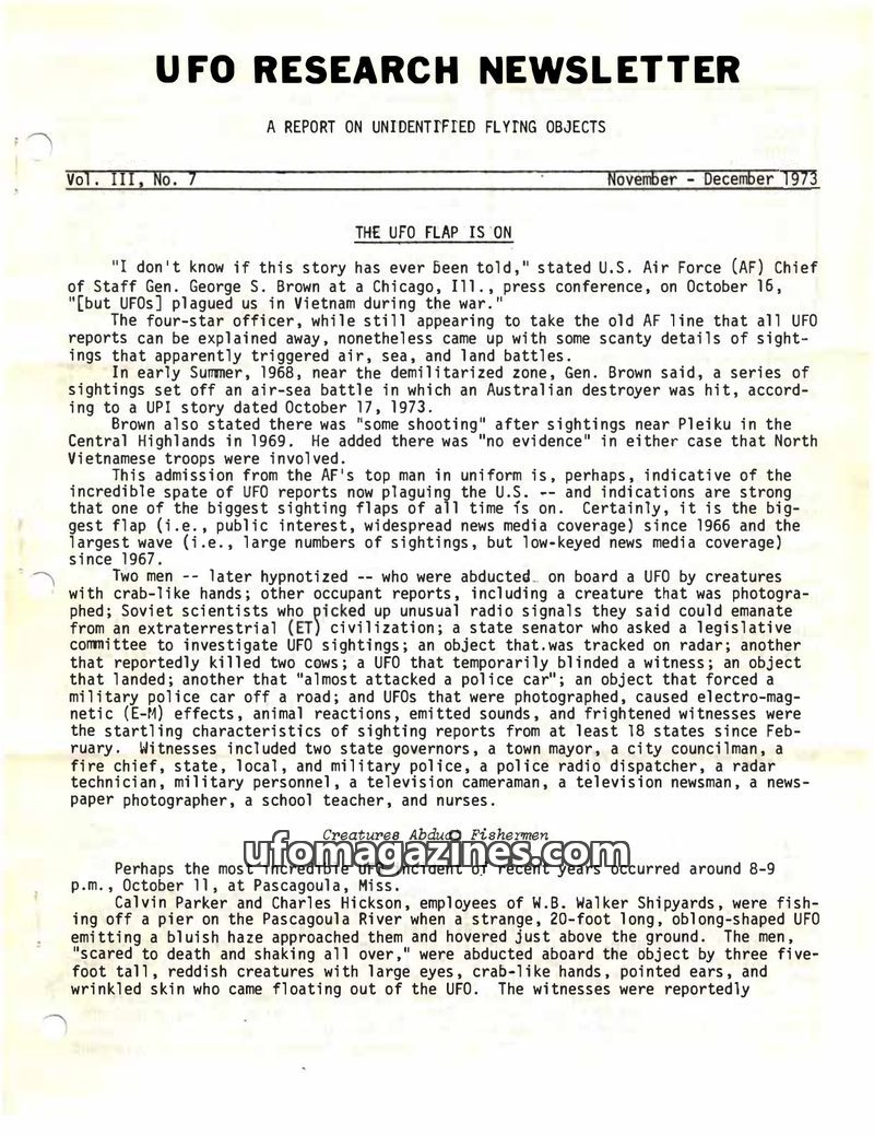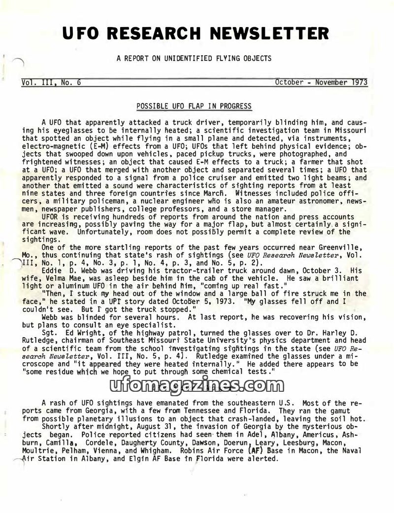 This issue of the UFO Research Newsletter details a significant increase in UFO sightings and public interest during late 1973, dubbed 'the UFO flap.' It includes reports of allege