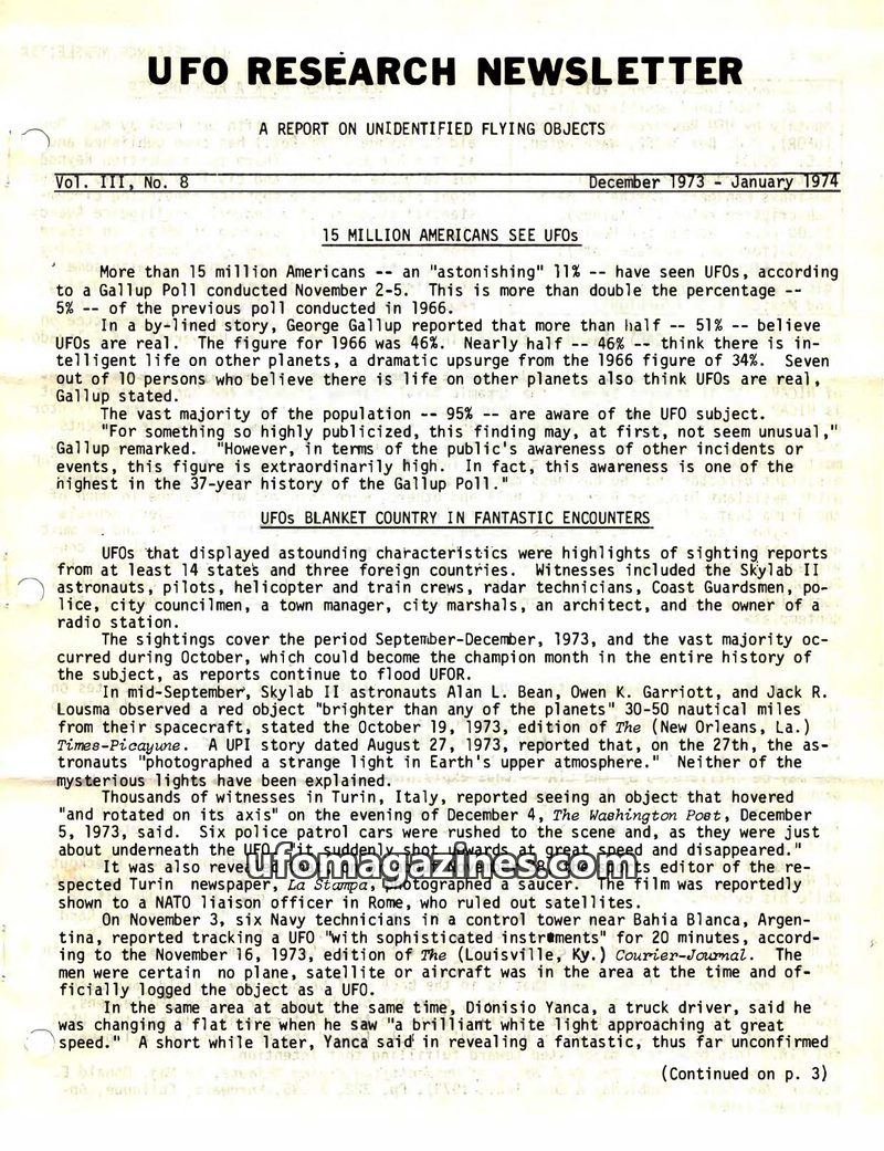 A Gallup Poll revealed that 15 million Americans have seen UFOs, with over half believing they are real. The issue details numerous sightings from September to December 1973 across