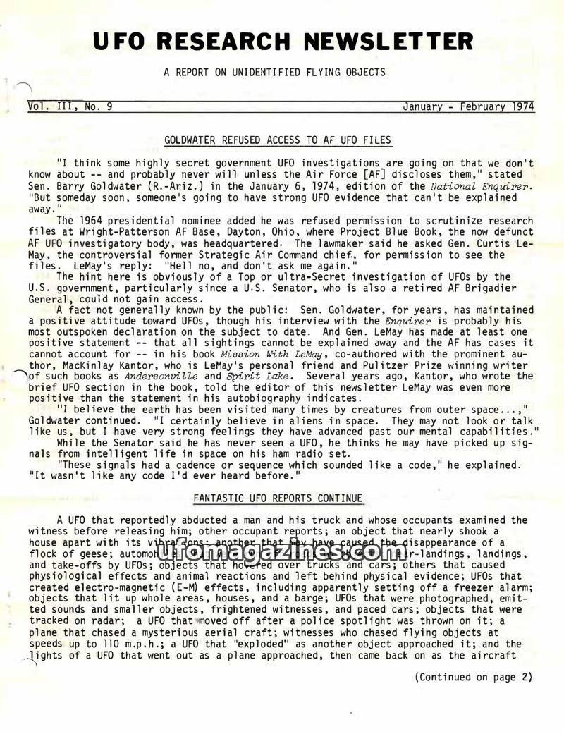 This issue of the UFO Research Newsletter reports on Senator Barry Goldwater's claim of being denied access to Air Force UFO files, suggesting a government cover-up. It details num