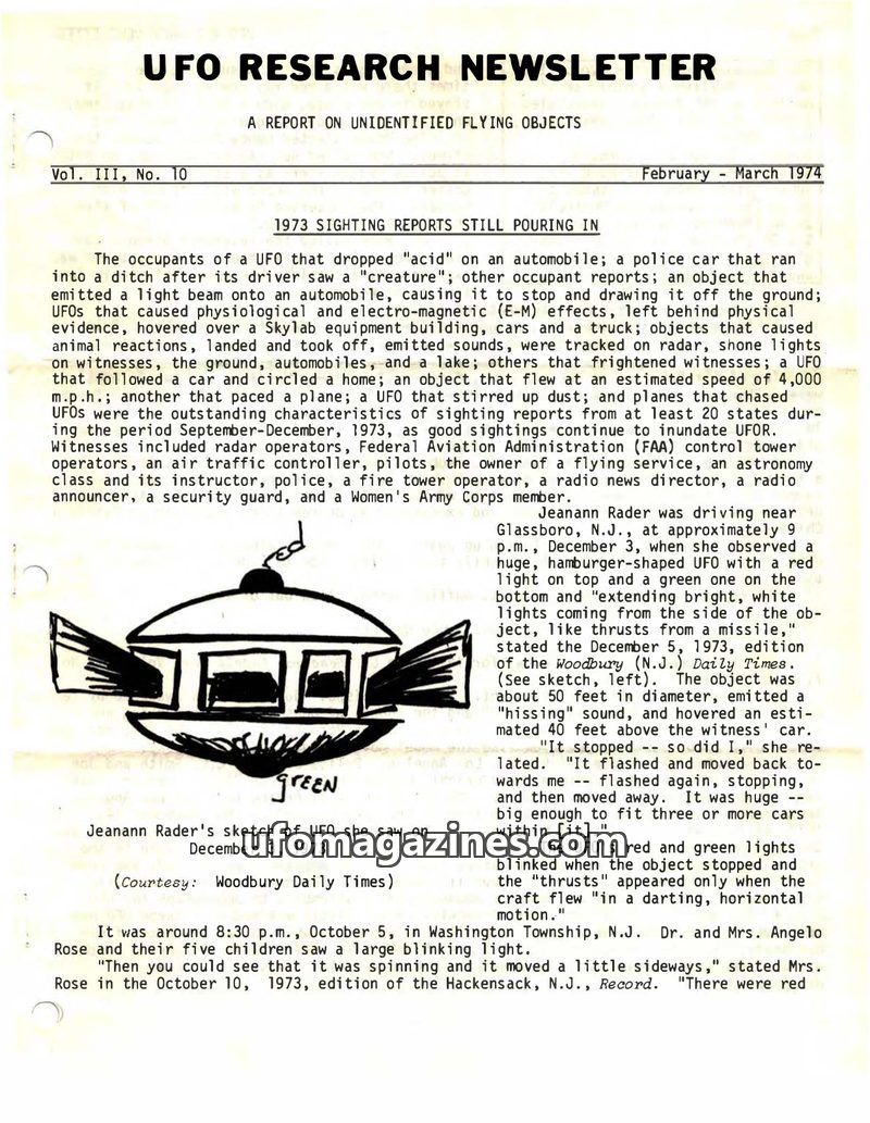 This issue of the UFO Research Newsletter covers numerous UFO sightings reported between October 1973 and March 1974, spanning at least 14 states and Canada. Reports include detail