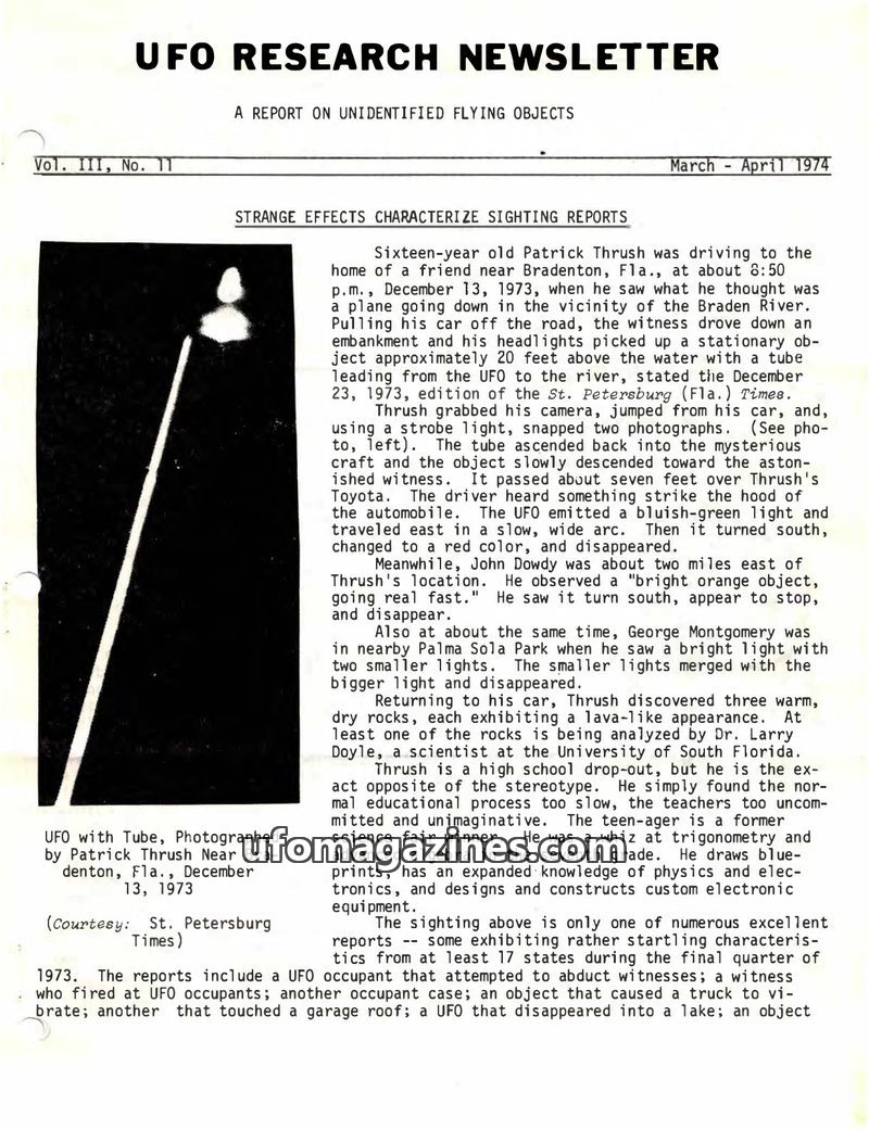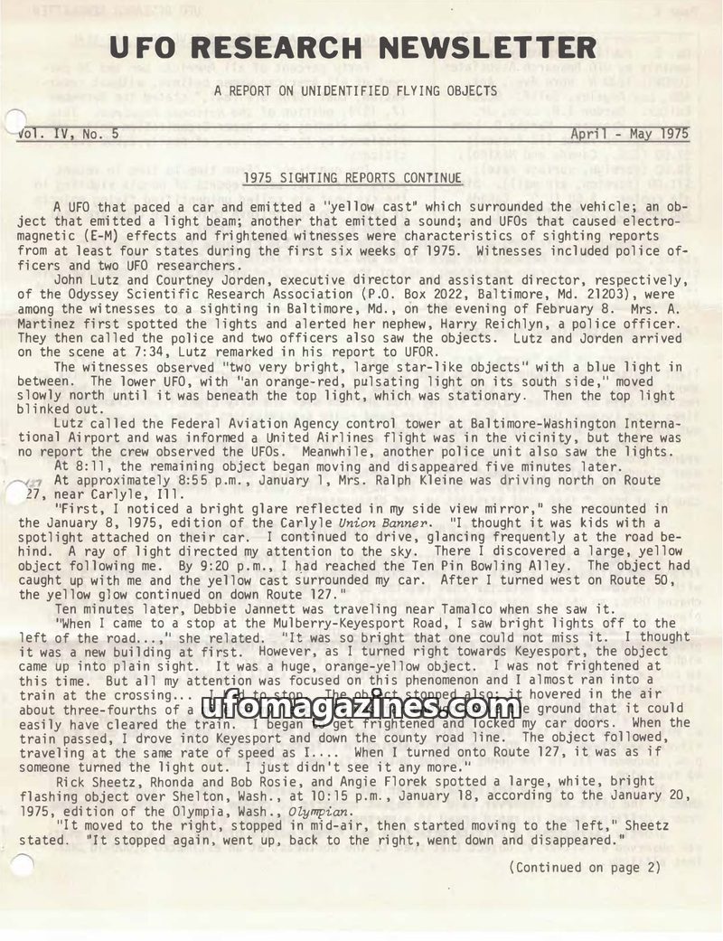 This issue of UFO Research Newsletter details numerous UFO sightings from early 1975, including reports of objects pacing cars, emitting lights and sounds, and causing electromagne