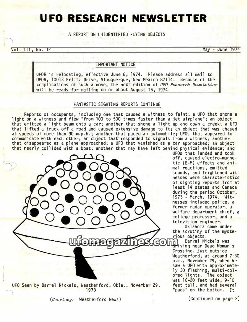 The year 1971 saw a decline in public interest in UFOs following the Condon report and the closure of Project Blue Book. Despite this, sightings continued, and UFOR received numero