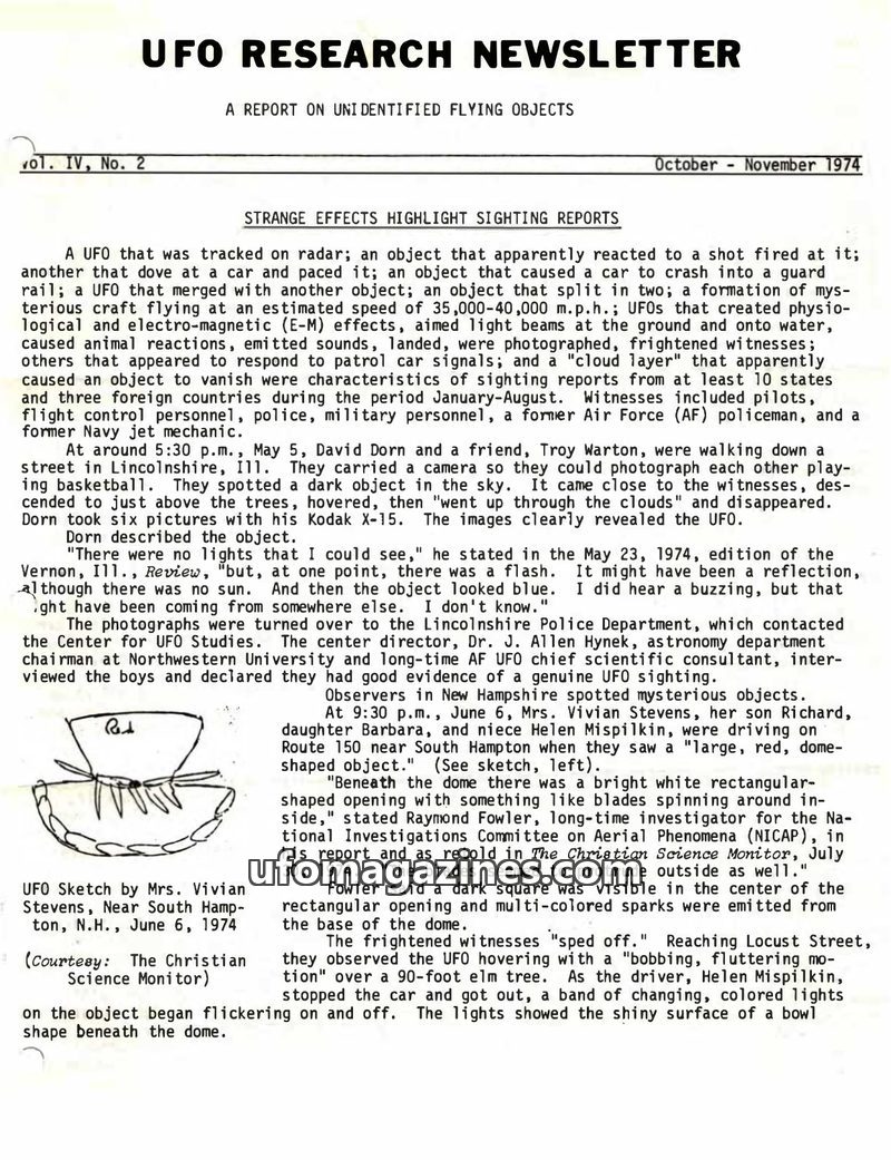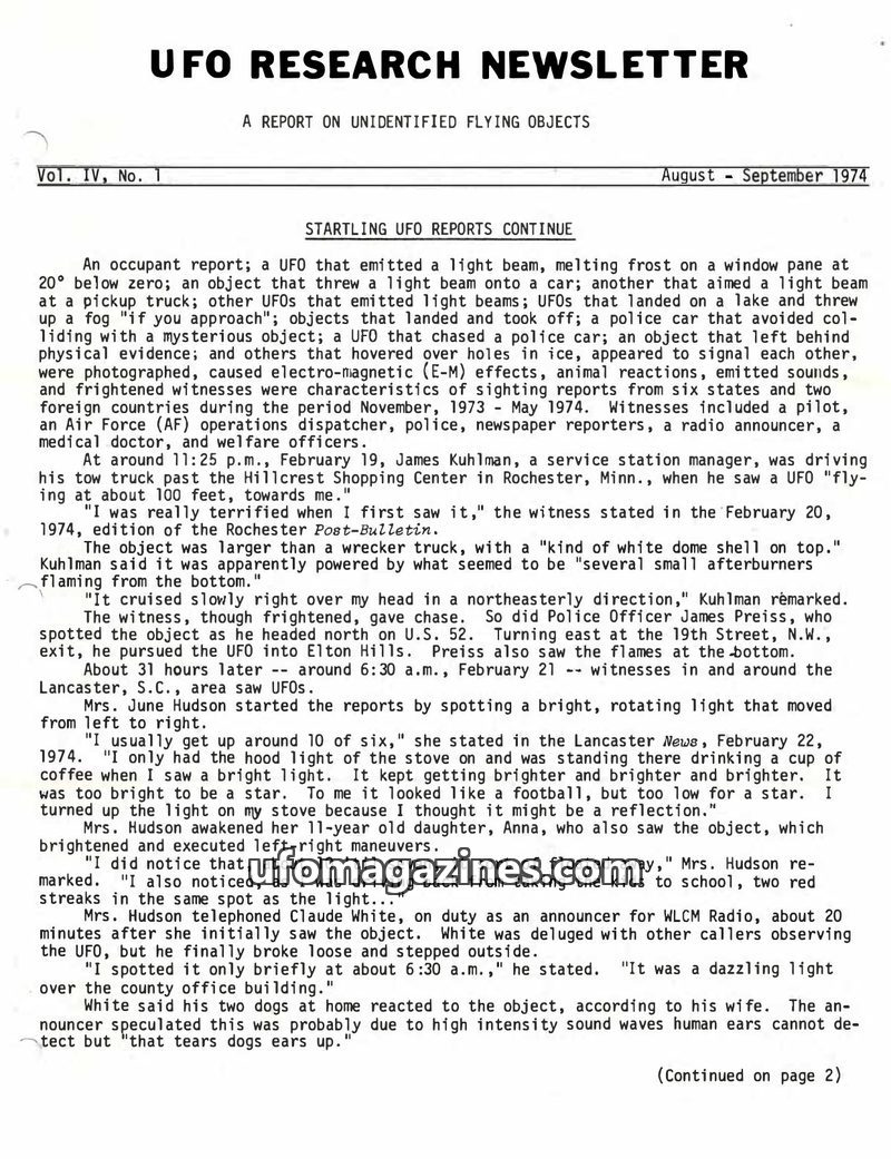 This issue of the UFO Research Newsletter reports on numerous UFO sightings from January to August 1974 across the US and three foreign countries. The reports detail a wide range o