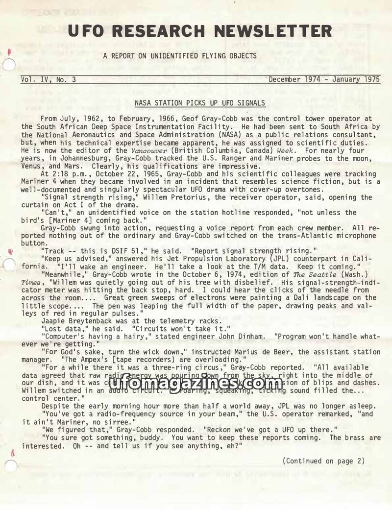 This issue of UFO Research Newsletter details numerous UFO sightings and incidents spanning from 1947 to 1974. A significant report from a NASA facility in South Africa describes t