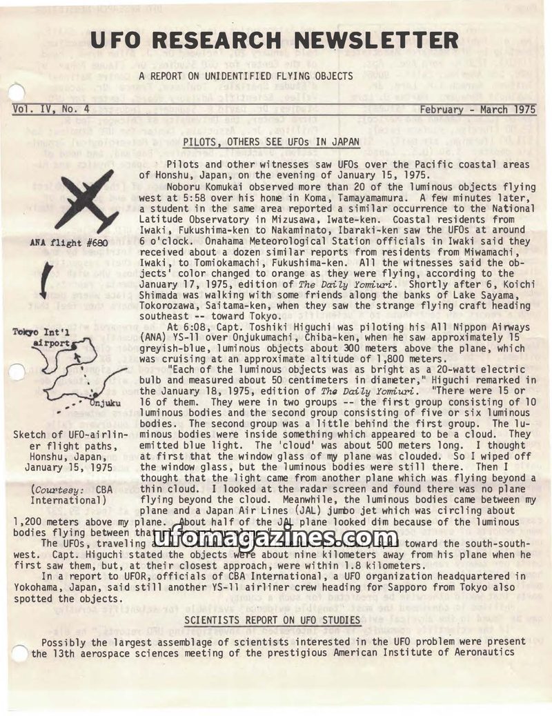 This issue of UFO Research Newsletter details numerous UFO sightings in Japan on January 15, 1975, reported by pilots and residents. It also covers scientific efforts and discussio