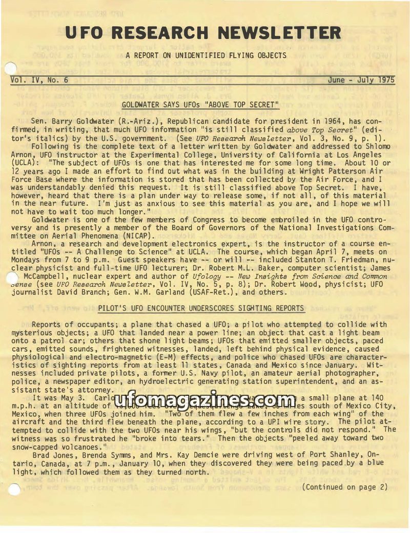 This issue of the UFO Research Newsletter covers Senator Barry Goldwater's confirmation of UFO information being classified 'above Top Secret.' It details numerous UFO sighting rep