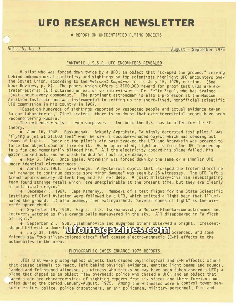 This issue of UFO Research Newsletter highlights numerous UFO encounters, particularly focusing on "Fantastic U.S.S.R. UFO Encounters Revealed," featuring reports compiled by Dr. F