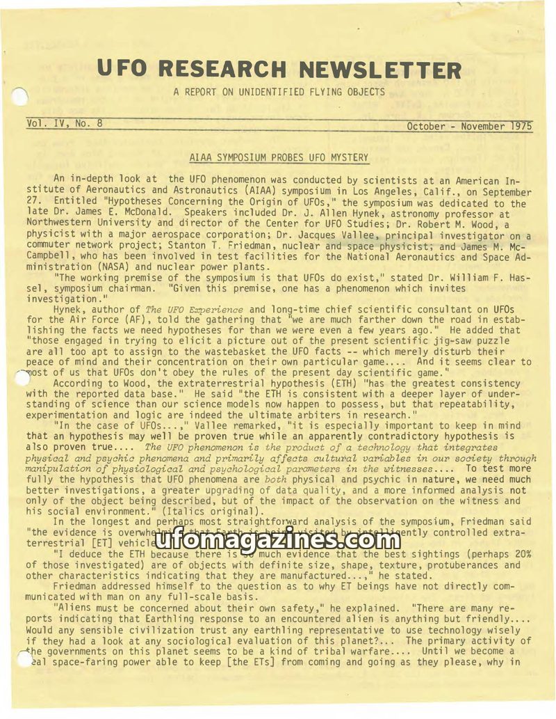 This issue of the UFO Research Newsletter covers an AIAA symposium on UFO origins, featuring prominent researchers like J. Allen Hynek and Jacques Vallee. Scientists like Dr. Alan