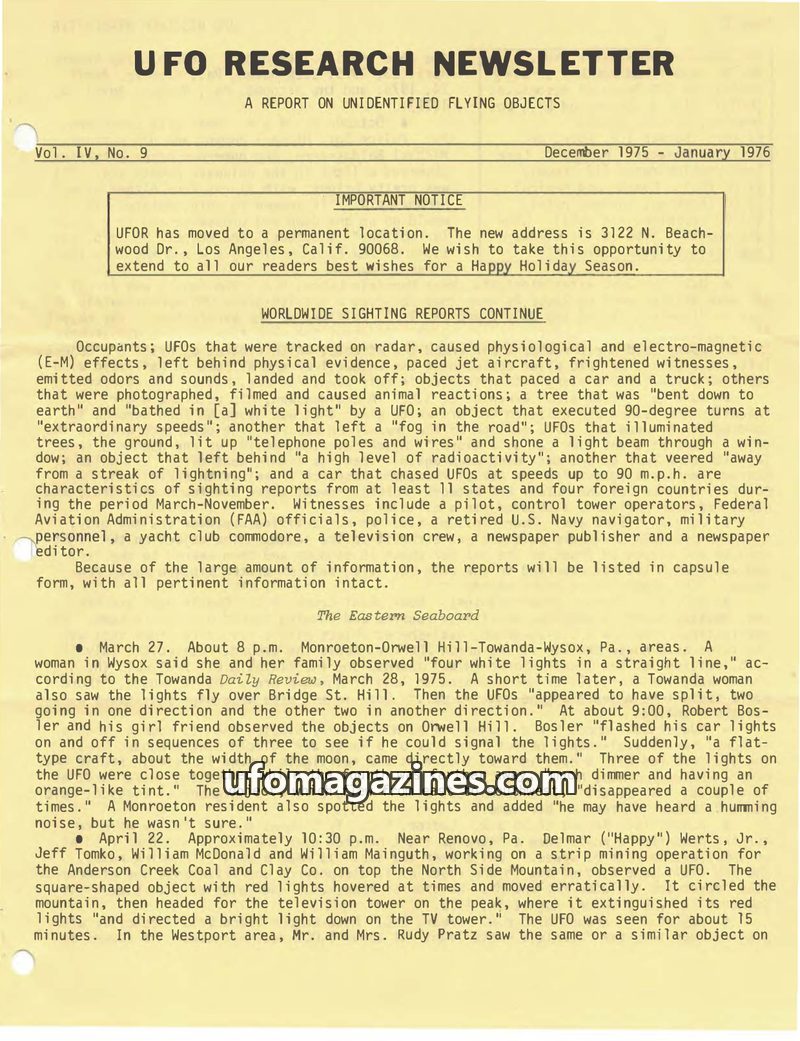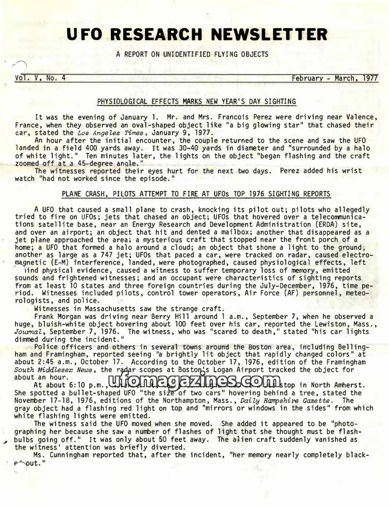 This issue of the UFO Research Newsletter details numerous UFO sightings from late 1975 and early 1976, highlighting bizarre characteristics and physiological effects on witnesses.