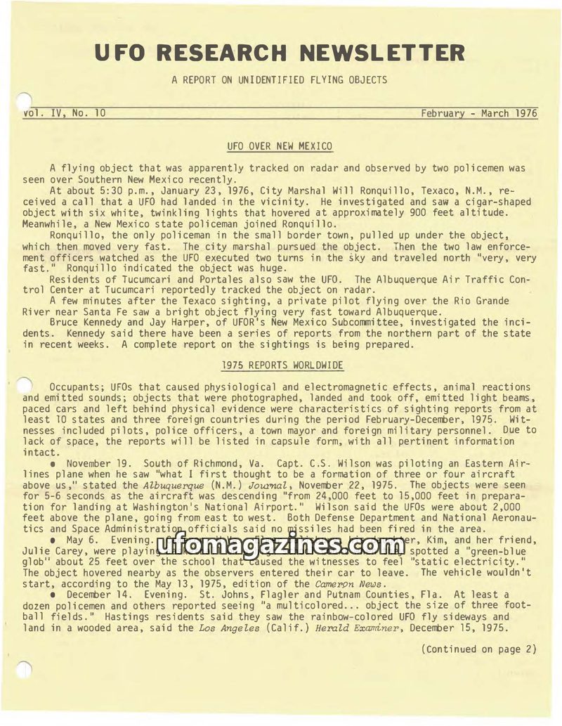This issue of the UFO Research Newsletter details a significant UFO sighting over New Mexico in January 1976, involving radar tracking and police observation of a cigar-shaped obje