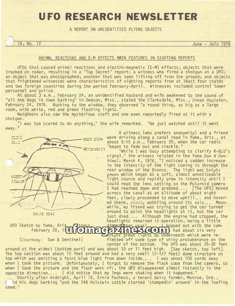 This issue of UFO Research Newsletter details numerous UFO sightings from February to April 1976, highlighting reports involving animal reactions and electromagnetic effects. Incid