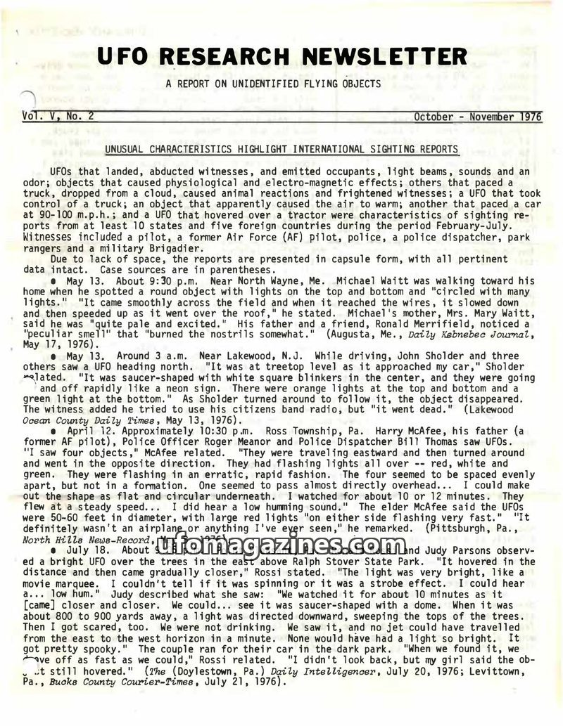 This issue of UFO Research Newsletter covers numerous international UFO sightings from February to July 1976, highlighting unusual characteristics such as landings, abductions, lig
