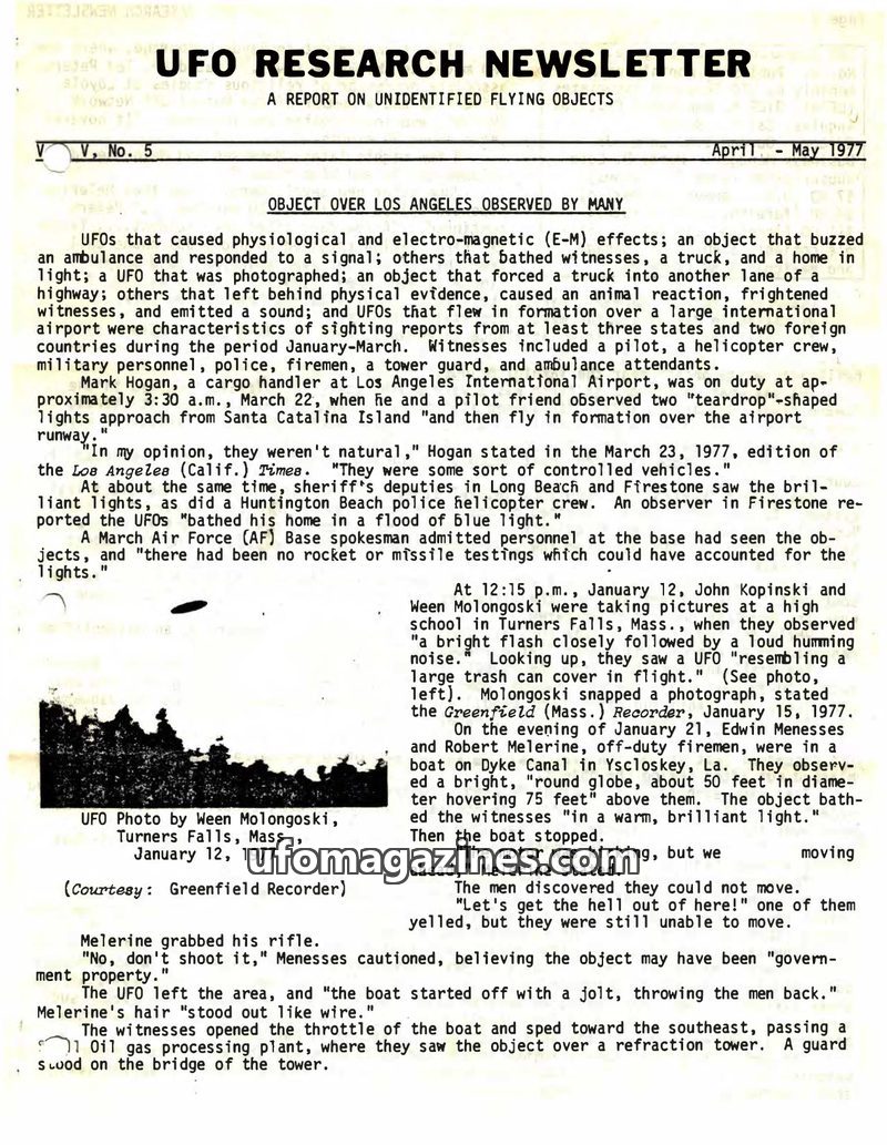 This issue of the UFO Research Newsletter covers numerous sightings from January to March 1977, spanning multiple states and countries, including reports of physiological and elect