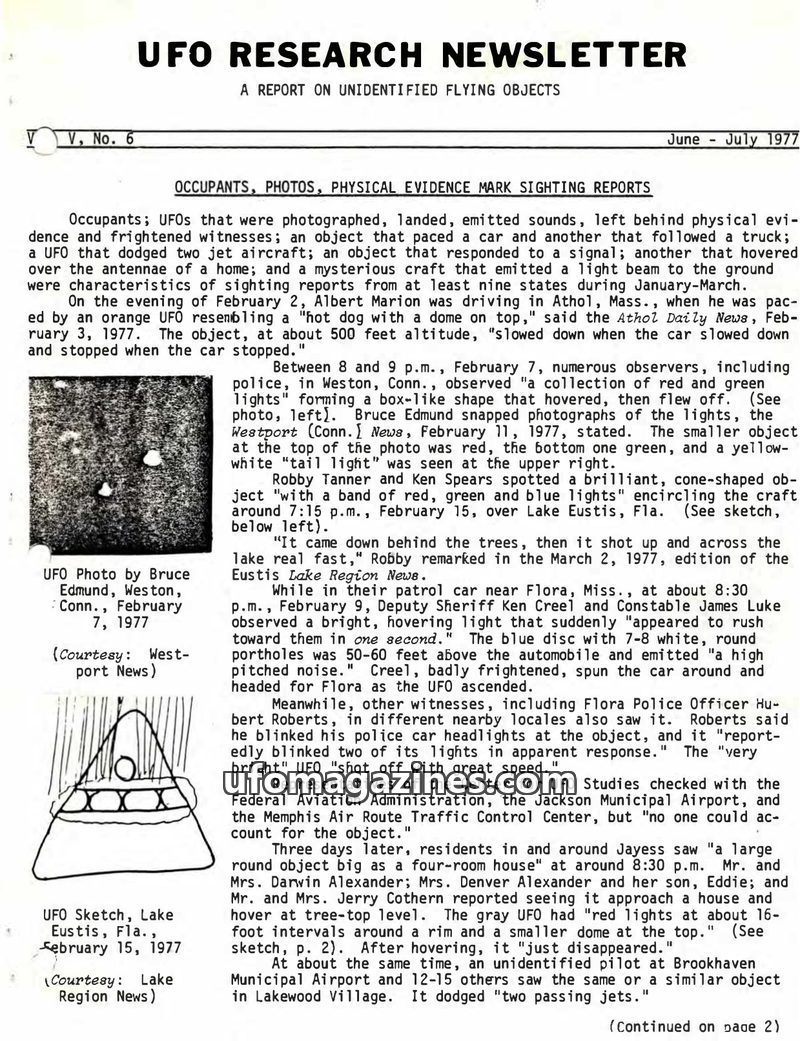 This issue of UFO Research Newsletter details numerous UFO sightings from February to June 1977 across at least nine states and five foreign countries. Reports include objects with
