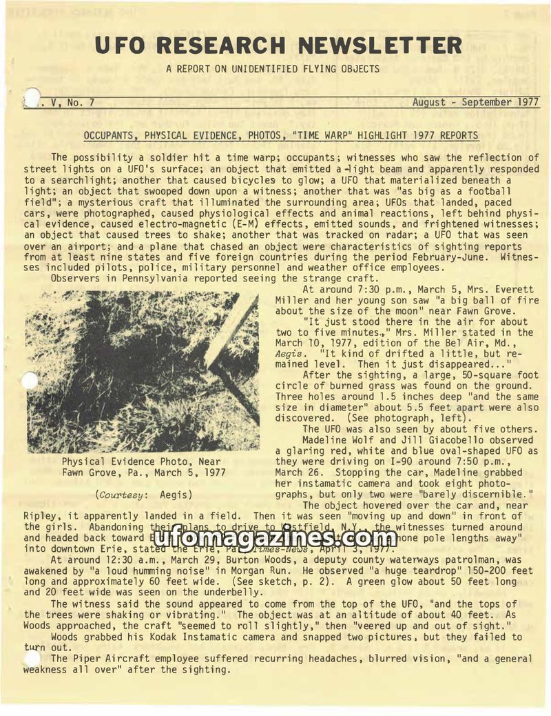 This issue of the UFO Research Newsletter details numerous UFO sightings from 1976. A prominent case involves Bill Pecha in Colusa, California, who witnessed a large UFO causing an