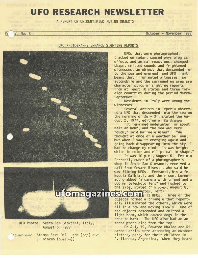 This issue of the UFO Research Newsletter covers a wide range of UFO sightings from March to September 1977, including photographic evidence from Italy and Argentina. Reports detai