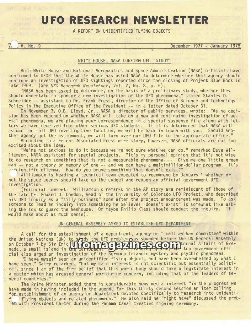 This issue of UFO Research Newsletter reports on the White House and NASA confirming a study into whether to resume UFO investigations. It also details Sir Eric Gairy's call for a