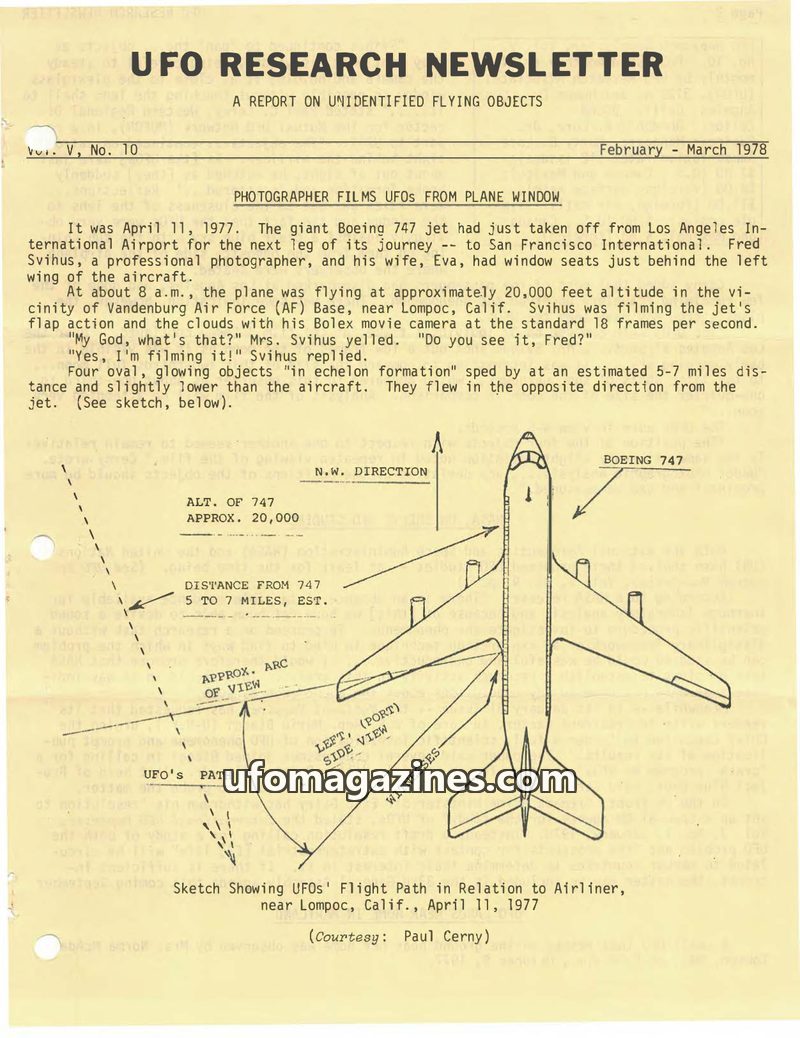 This issue of UFO Research Newsletter covers a wide range of UFO-related topics. It details a sighting by Fred and Eva Svihus of four oval, glowing objects filmed from a Boeing 747