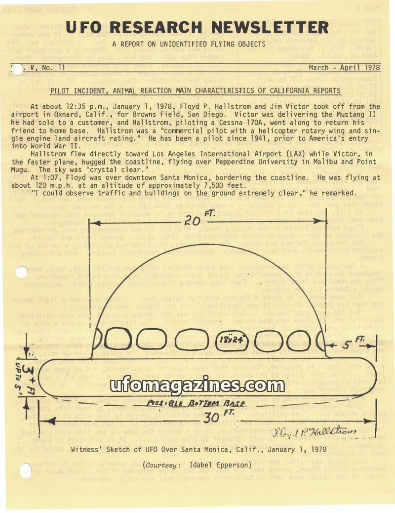 This issue of UFO Research Newsletter details a pilot's encounter with a UFO over Santa Monica, California, on January 1, 1978, describing its characteristics and the subsequent ps