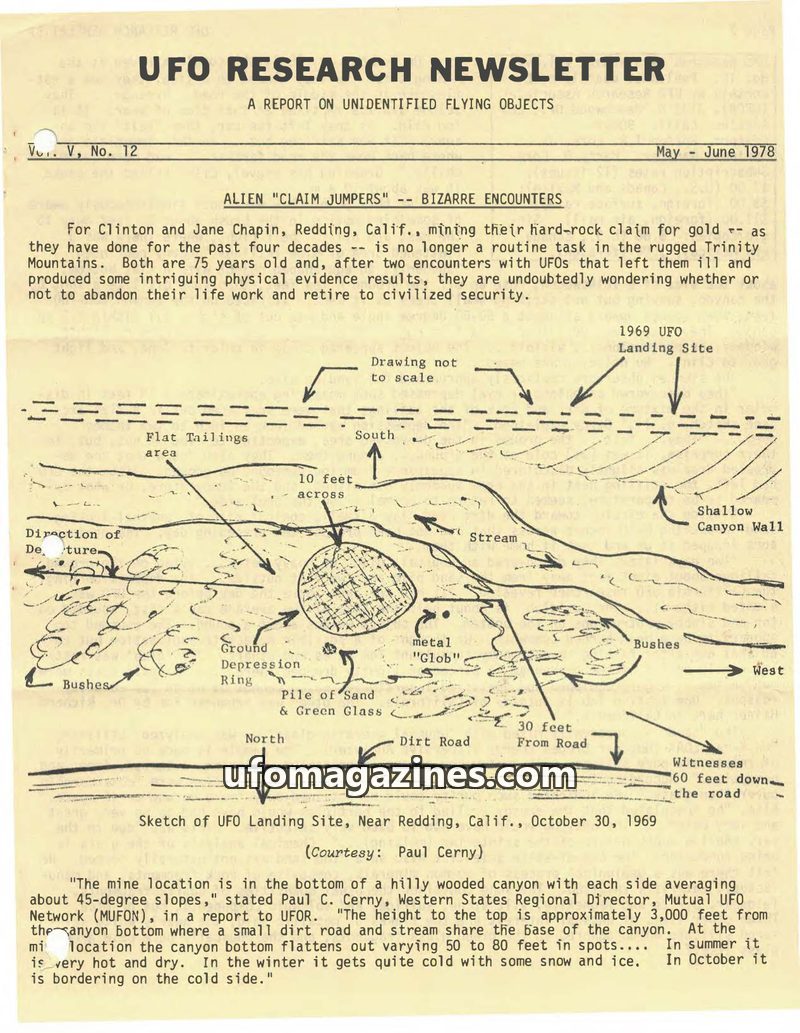 This issue of the UFO Research Newsletter covers bizarre encounters in California, including the Chapin's mining claim incident with a metal 'glob' and physical evidence, and a sig