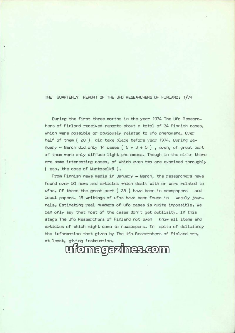 The UFO Researchers of Finland received 34 reports of possible UFO phenomena in the first quarter of 1974, with 14 occurring in January-March. Over half of the reported cases actua