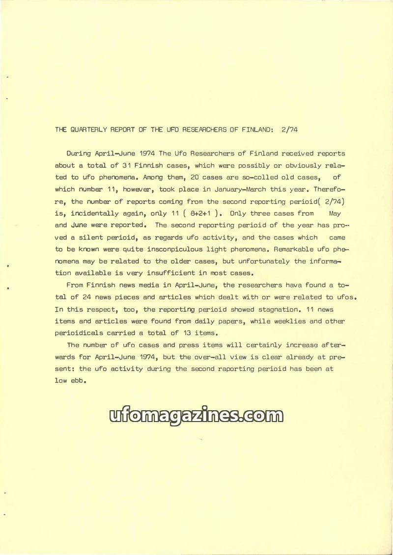 The Ufo Researchers of Finland reported 31 UFO cases during April-June 1974, with 11 new reports in this period (2/74). The activity was described as a 'silent period' with mostly